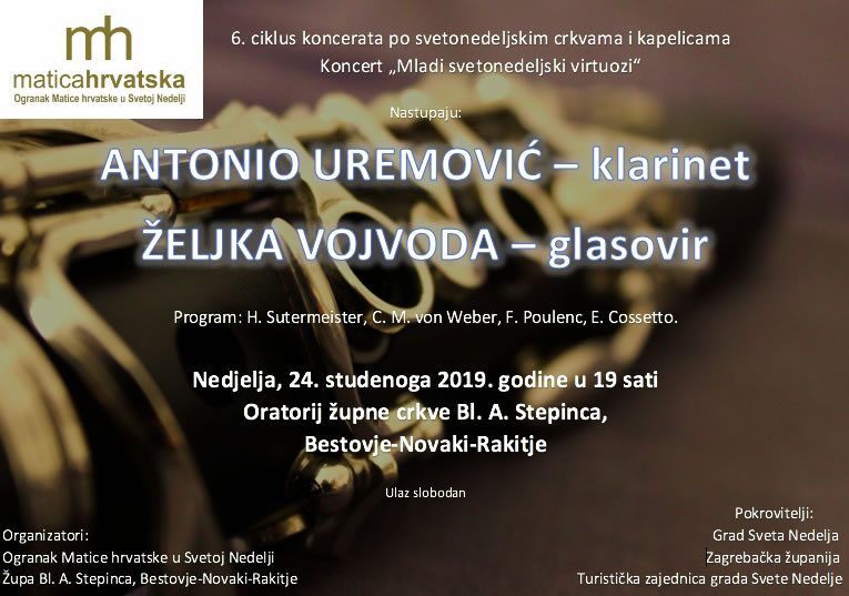 U okviru 6. sezone ciklusa klasične glazbe „Po svetonedeljskim crkvama i kapelicama” svetonedeljskoj će se publici predstaviti mladi svetonedeljski klarinetist Antonio Uremović uz glasovirsku pratnju uvažene pijanistice Željke Vojvode. U nedjelju, 24. studenoga 2019. godine, s početkom u 19 sati nastupit će u dvorani Oratorija crkve Bl. Alojzija Stepinca u župi /Bestovje-Novaki-Rakitje/, a na programu su skladbe H. Sutermeistera, C. M. von Webera, F. Poulenca i E. Cossetta.